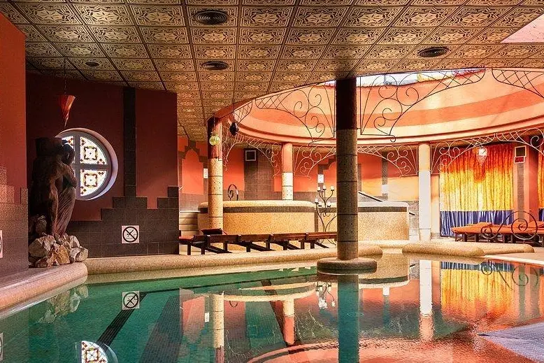 A medencék, pezsgőfürdők, gőzfürdő és szauna használata a francia mintára épült élményfürdőben és a marokkói hangulatú fürdőházban.